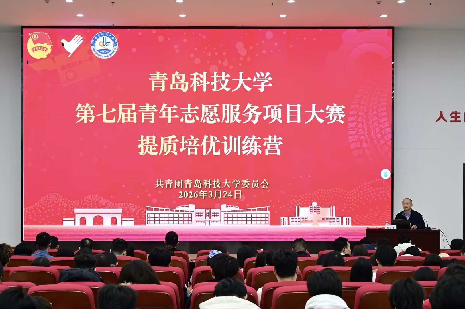 为深入落实第六届山东省青年志愿服务项目大赛要求,推进志愿服务项目化、品牌化、专业化建设,深化实践育人成效,3月24日,青岛科技大学第七届青年志愿服务项目大赛提质培优训练营在崂山校区团学报告厅举办,青岛市团校副校长、山东省青年志愿者协会副理事长曲成伟受邀授课指导,校团委相关负责人,各学院、校区负责志愿服务工作教师以及各项目指导教师、骨干成员共计300余人参会。