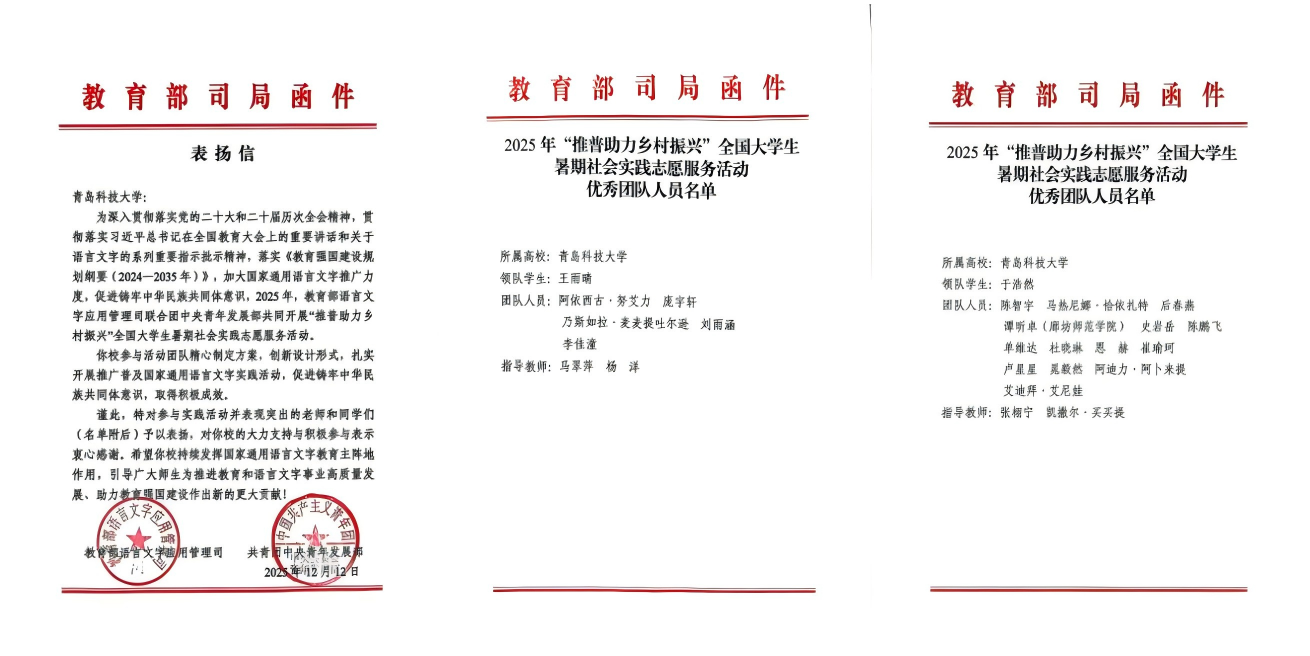 近日,学校收到来自教育部语言文字应用管理司与共青团中央青年发展部联合发来的表扬信,对学校“鲁疆同音石榴红”推普助力乡村振兴实践团、“青春探疆 筑梦天山”社会实践队的突出表现给予高度评价,并对实践师生团队进行表扬。